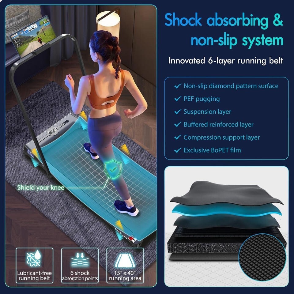 ?SHOCK-REDUCING ANTI-SKID? The 5-layer running belt significantly reduces impact during movement, minimizing joint stress and providing knee protection. Its surface features a durable slip-resistant diamond-pattern texture, while the sturdy handrail offers stability and fall prevention. Together, they ensure confidence and security during workouts.