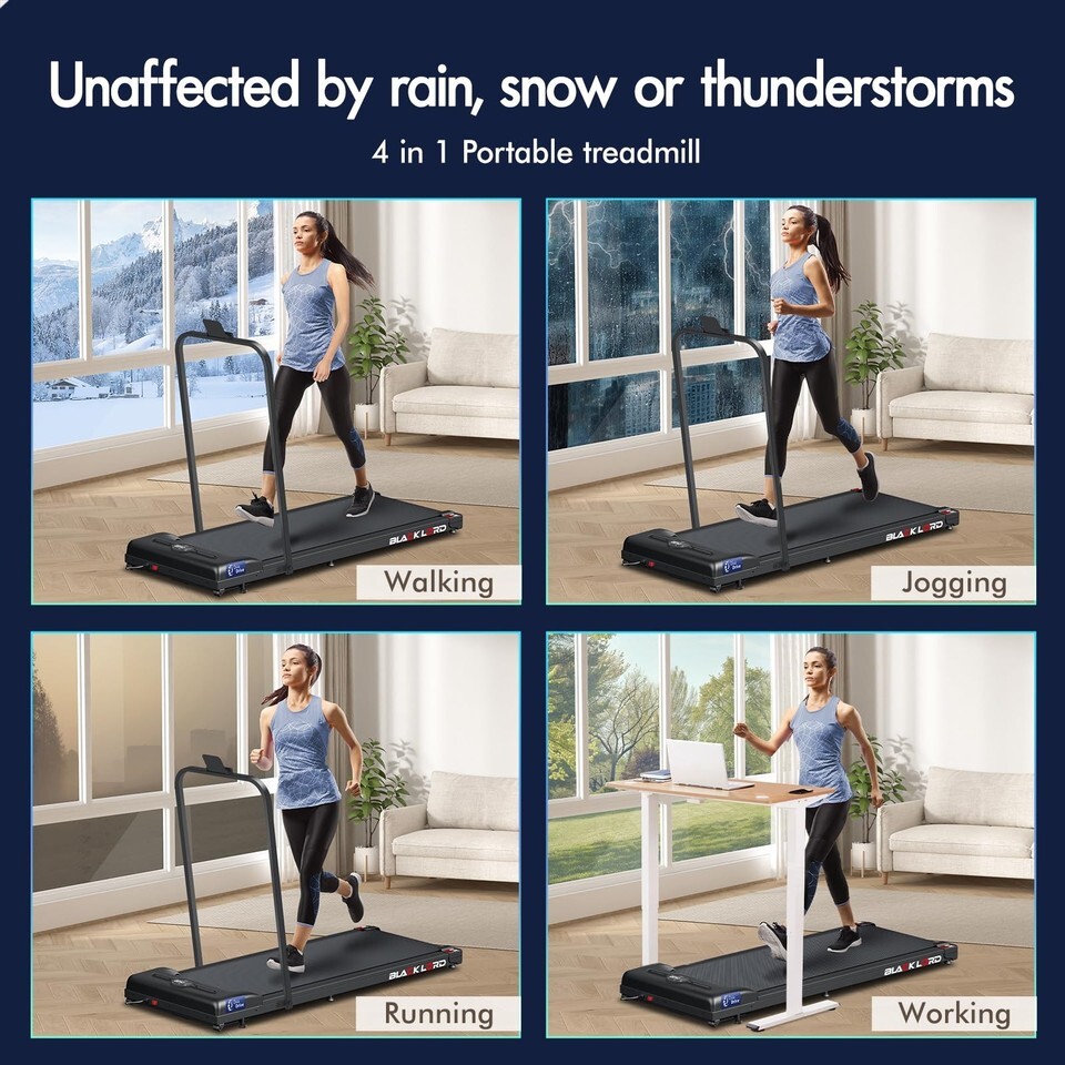 ?RHYTHMIC WORKOUT EXPERIENCE? This 4 in 1 walking pad with handle bar offers working, walking, running and jogging modes, with speeds adjustable from 0.5-6.2 mph to match your fitness goals. Enjoy music through the integrated Bluetooth speaker, transforming every session into a fun, motivational experience that delivers an immersive home gym feel.