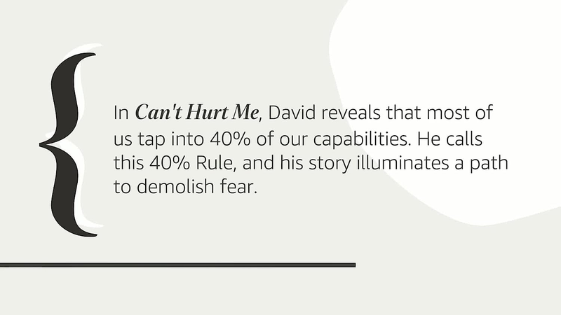 In Can't Hurt Me, he shares his astonishing life story and reveals that most of us tap into only 40% of our capabilities. Goggins calls this The 40% Rule, and his story illuminates a path that anyone can follow to push past pain, demolish fear, and reach their full potential.