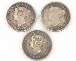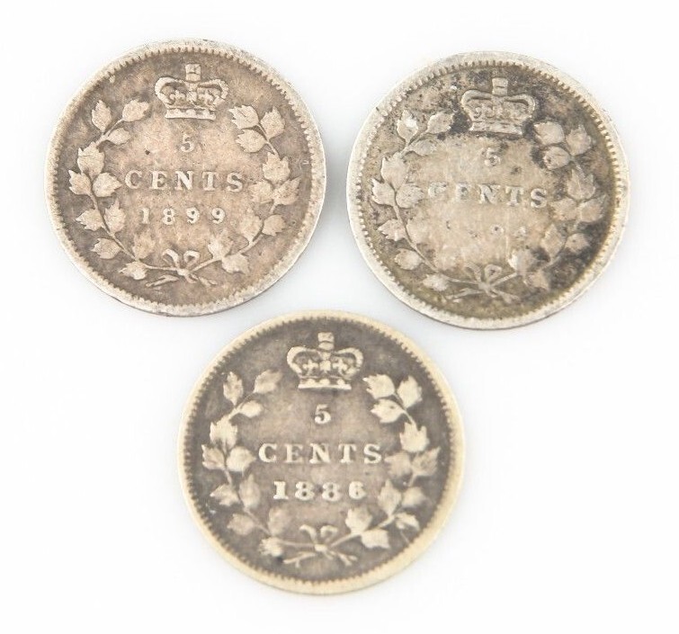 Monedas de plata canadienses de 5 centavos de 1886-1899, lote de 3
