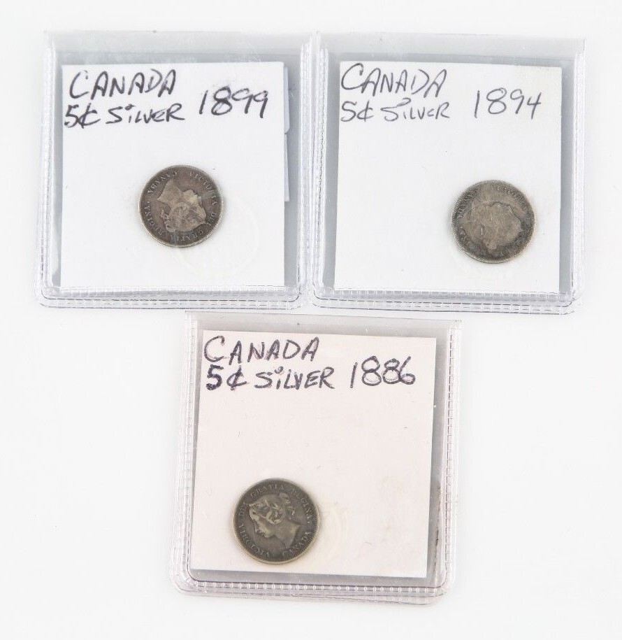 Lote de monedas de plata de 5 centavos de Canada (3) 1899 VF+ 1894 VG+ 1886 VF 5C 5 KM#2
