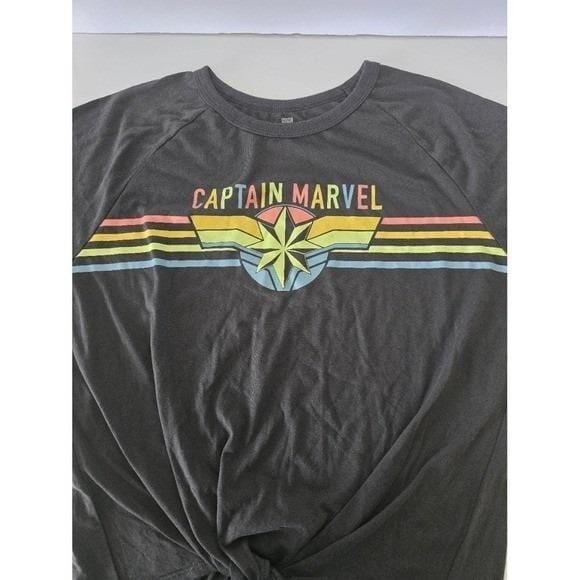 Keywords: Captain Marvel T Shirt, Marvel Comics Shirt, Womens Graphic Tee, Tie Front Top, Rainbow Stripe Shirt, Superhero Apparel, Marvel Merch, Casual Top, Plus Size T Shirt, Disney Marvel, Movie Merchandise, Feminine T Shirt, Summer Top, Graphic Print Shirt