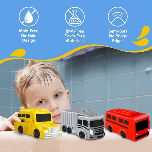 - Mold-Free Bath Toys: Set of 3 cool transportation vehicles - a school bus, a truck, and a city bus, designed for endless bath time fun. No Hole Bath Toys The sealed bottom prevents water accumulation. Suitable for playing in and out of the tub.