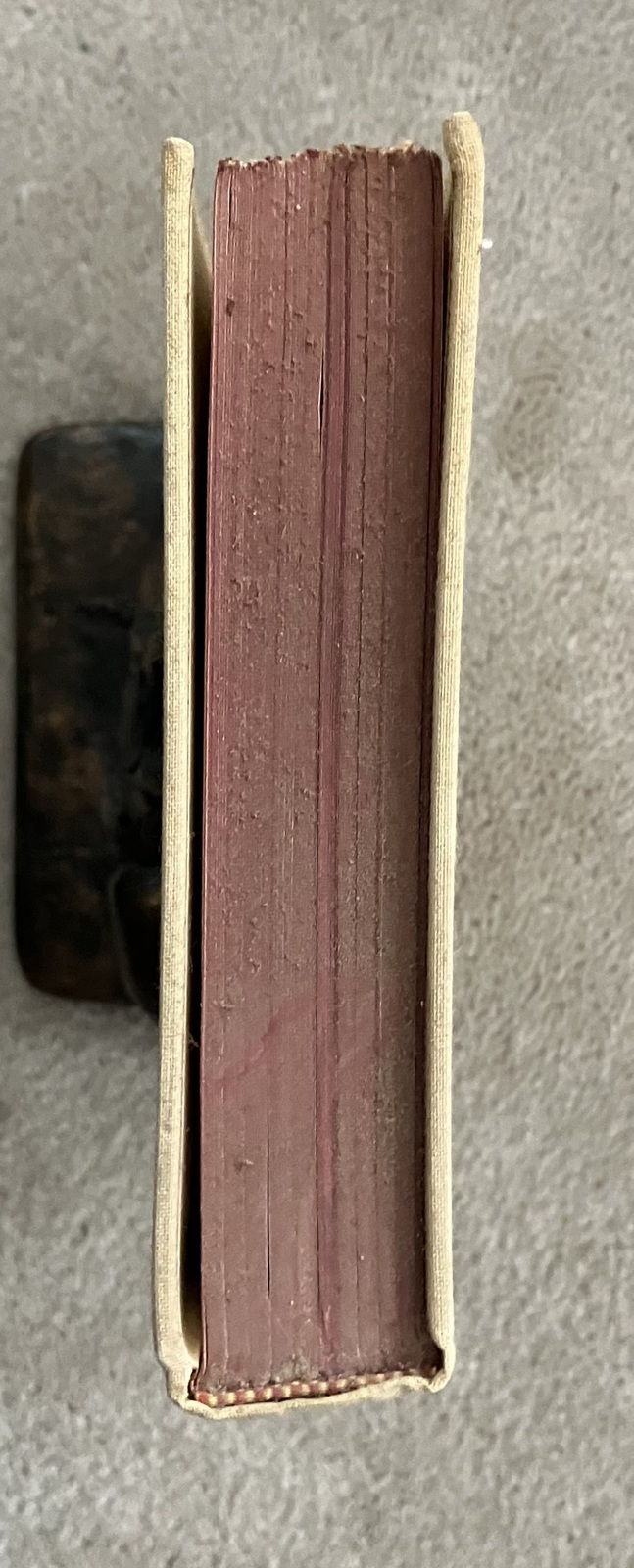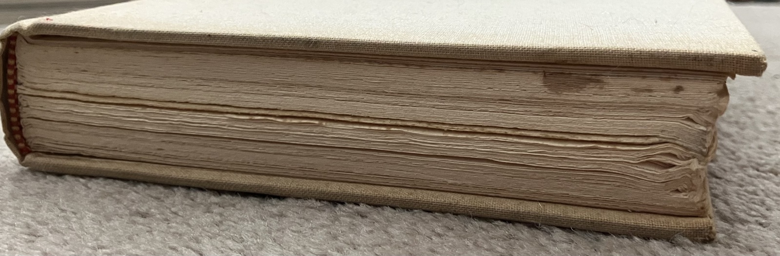 Dust jacket has chipping/tears to edges and staining. Book edges have discoloration; please see bottom edge view. Pages have a slight musty odor when nose close to pages, not noticeable to me at reading distance. Please take note if you have allergies.