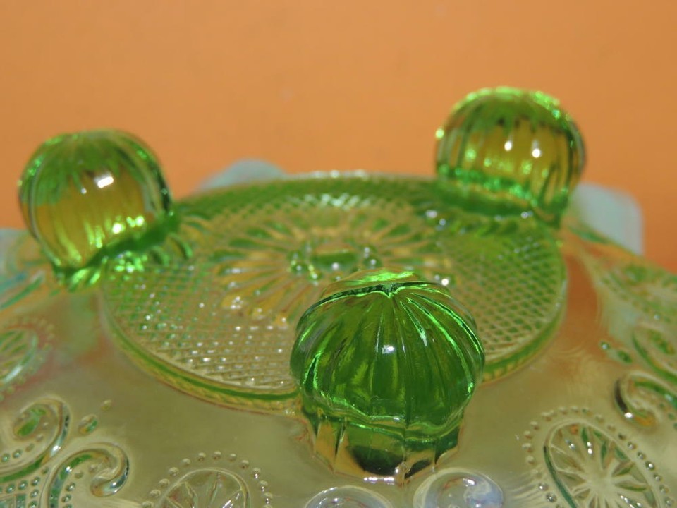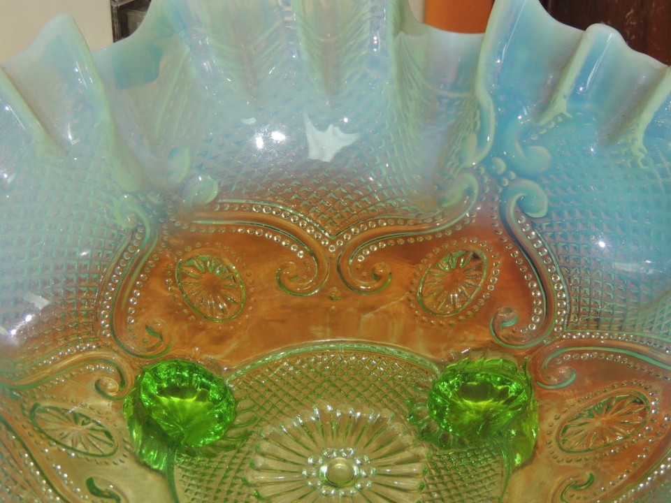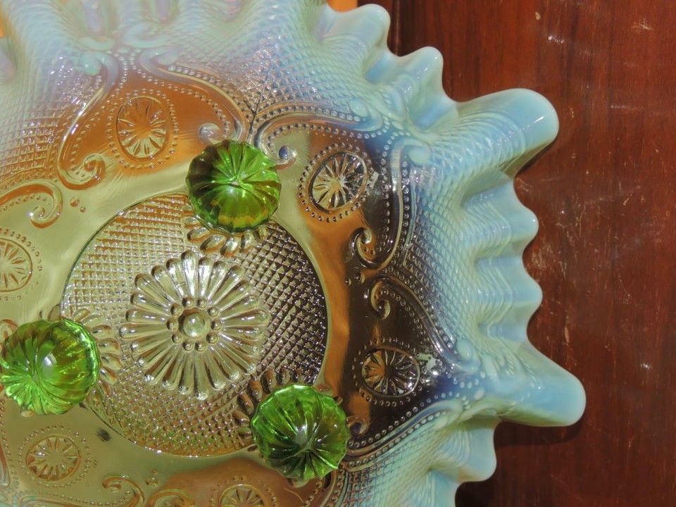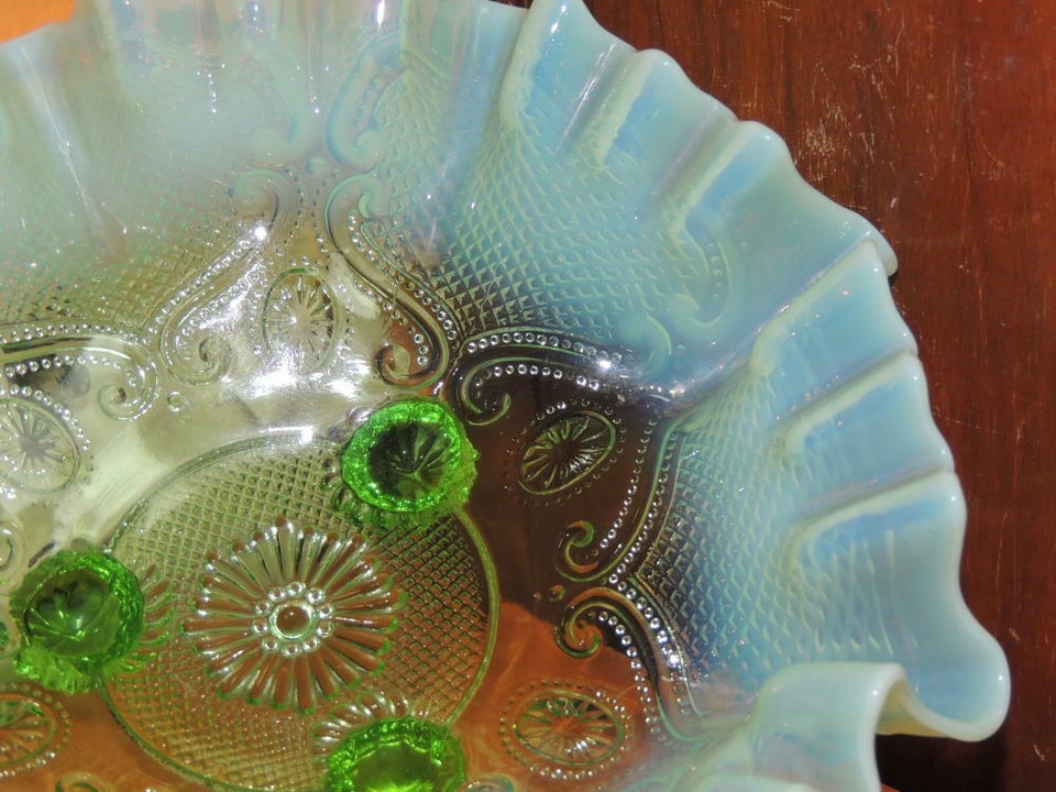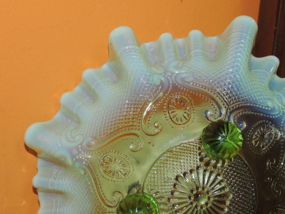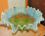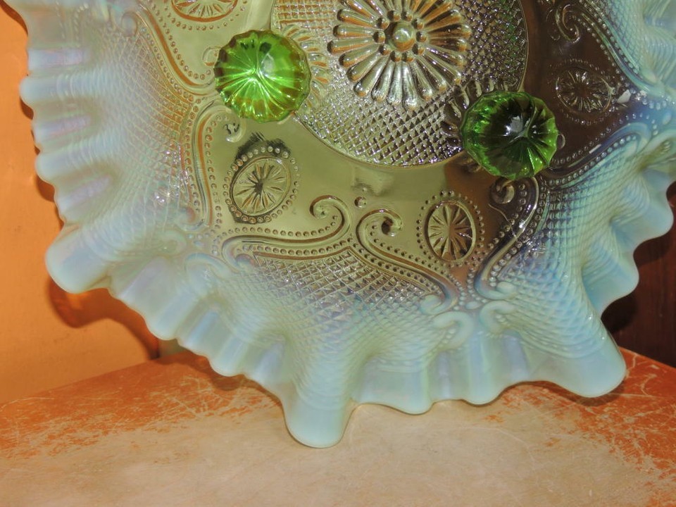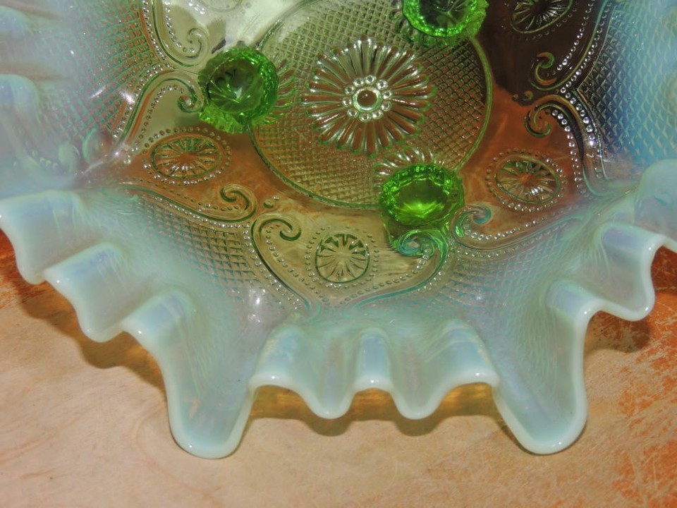 - Carnival Glass Bowl 8.5" Green Opalescent bead quilted daisy scroll Ruffled Edge