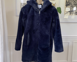 Carolina Belle dark blue, teddy bear, plush faux fur hooded three-quarter length zip front coat with welt hip pockets. 100% polyester. Lined. 34 inches shoulder to hem and 20 inches armpit to armpit. the pockets lining is torn on the inside and items placed in the park. It will drop into the lining. It?s an easy fix, but I?ll let you do it. Priced accordingly.
