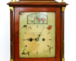 The clock features a stepped top with pointed and rounded bronze acorn finials and reticulated brass inlay on the front and sides. It finished off at the top with a bronze swinging handle. Painted metal clock face shows the hand painted automaton dog and horse in front of a stable with a rider in top hat. The horse and the dog move at each hour. Four hand painted points around the clock dial feature a dog, a fox, stirrups with crop and a French fox hound horn. At the center of the dial it reads Carter Bowles Cheltenham. The clock face is covered by a hinged wood framed glass door with key. The base has bronze scrolling bracket feet. The two front corners have reeded columns with brass capitals and bases. Each side features brass sound fret with an intricate, ornate scrollwork design. The clock back is covered by a hinged wood framed glass door. There is no key for this door. It shows the inner workings of the clock.