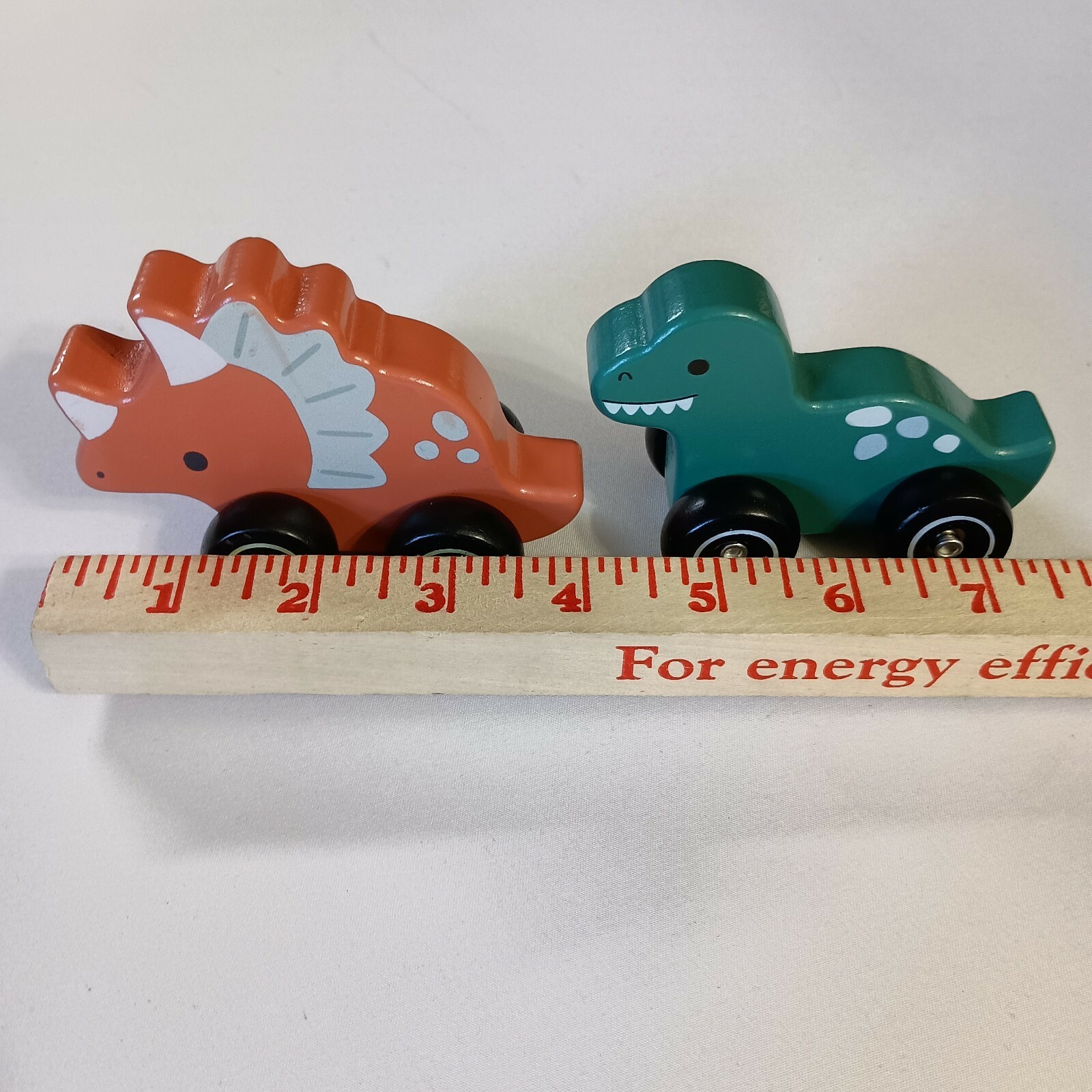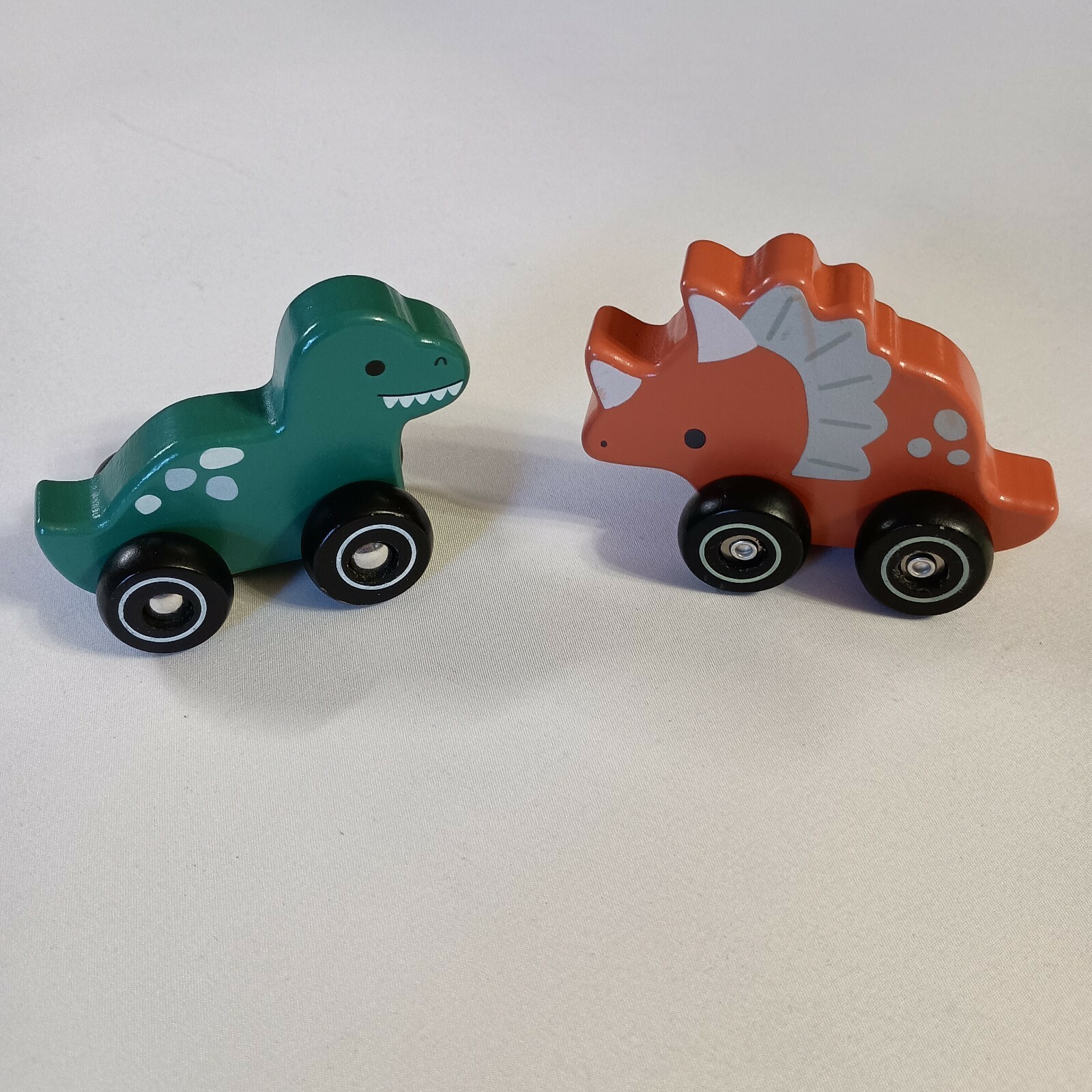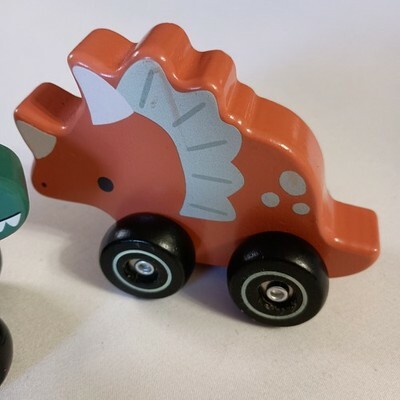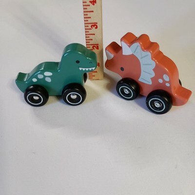 The product is a lot of 2 rolling dinosaurs toys made of wood by Carter Toy. The green and pink dinosaurs are designed to learn and develop sensory skills in children. With a car theme and multi-color design, these toys are a fun and interactive way for kids to engage with their environment and enhance their motor skills through play. Made from durable wood material, these rolling dinosaurs provide hours of entertainment and educational value for young children. Normal wear. Sizes are approximate.