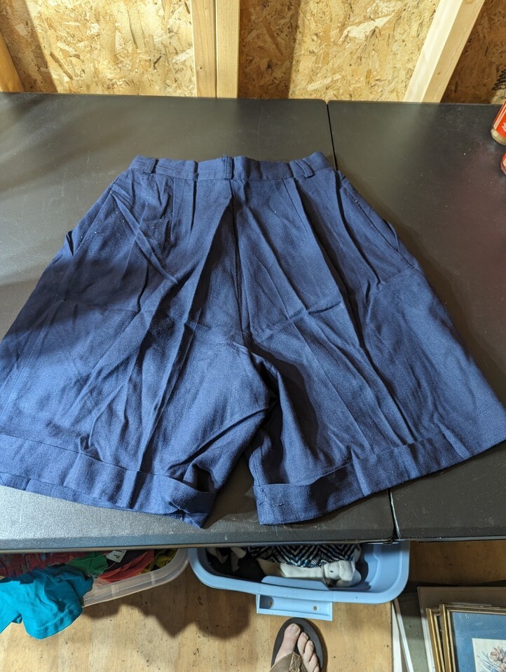 These are Casablanca ladies shorts made of a lightweight and stretchy polyester blend fabric in a solid blue color. They have a pleated front, a button closure, and slash pockets. The waist size is 28 inches and the size type is regular. These shorts are machine washable and suitable for summer, fall, and spring. They also feature cuffs and are branded as Ladies.