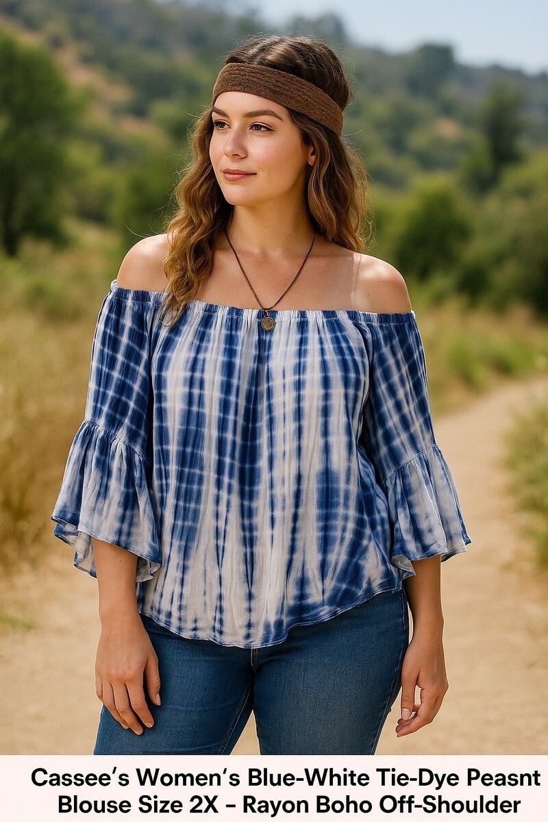 - Cassee’s Women’s Blue White Tie-Dye Peasant Blouse Size 2X – Rayon Boho Off-Shou
