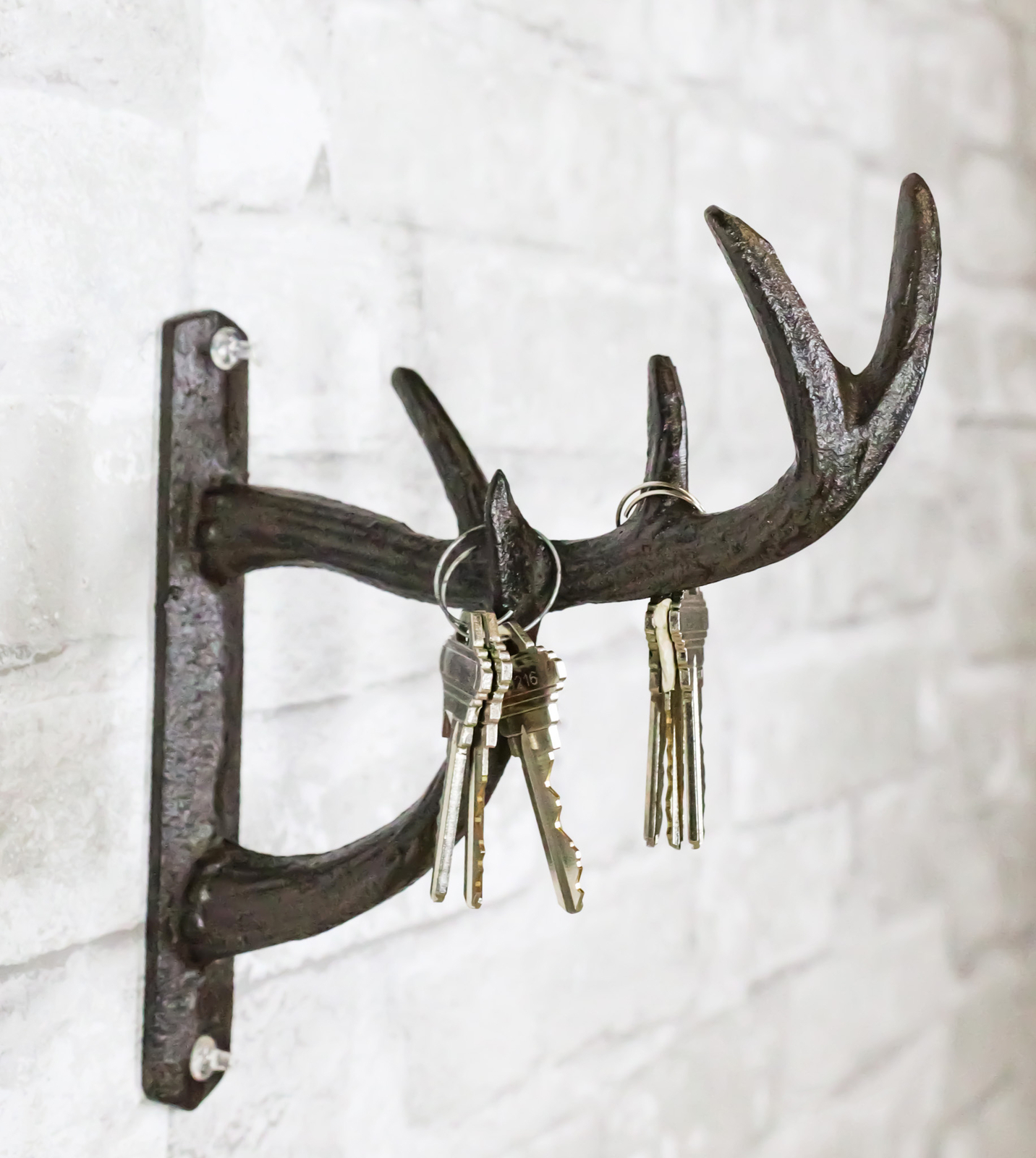 ? The antique look of this deer antler wall hook is wonderful for your front entry, living room, bedroom, game room, entertainment room, and more; adds a touch of class and distinction to your home. Hanging screws are not included with the sculpture.