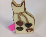 This handmade folk art wooden cat sign plaque features a small size of approximately 5.5 inches in height and 3 inches in length. The off-white color with multicolor accents adds a charming touch to any room. Made of wood, this decorative wall hanging is designed in a cat shape, perfect for cat lovers and admirers of folk art. The plaque is crafted with a hanging mounting for easy display and adds a whimsical touch to your home decor. Normal wear.
