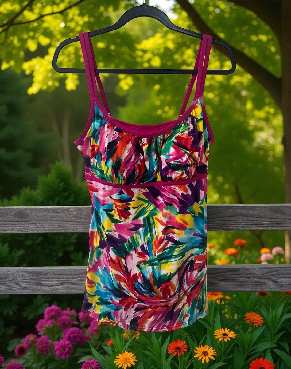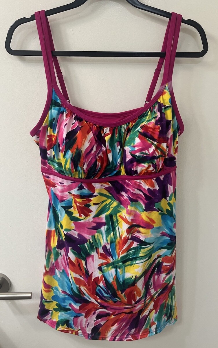 The Catalina Swimdress in size 2X is a vibrant and colorful one-piece swimsuit designed for women. It features an abstract colorful pattern, perfect for adding a fun and playful touch to your summer wardrobe. This swimdress comes in a bright multicolor design, making it ideal for beach days or poolside relaxation. The Catalina brand ensures high quality and style, making this swimdress a stylish choice for any woman looking to make a statement with their swimwear. There is a little light spot on the straps as shown in photos. Suit has not been worn...hygiene liner still attached, see photo. Please let me know if you have any questions!