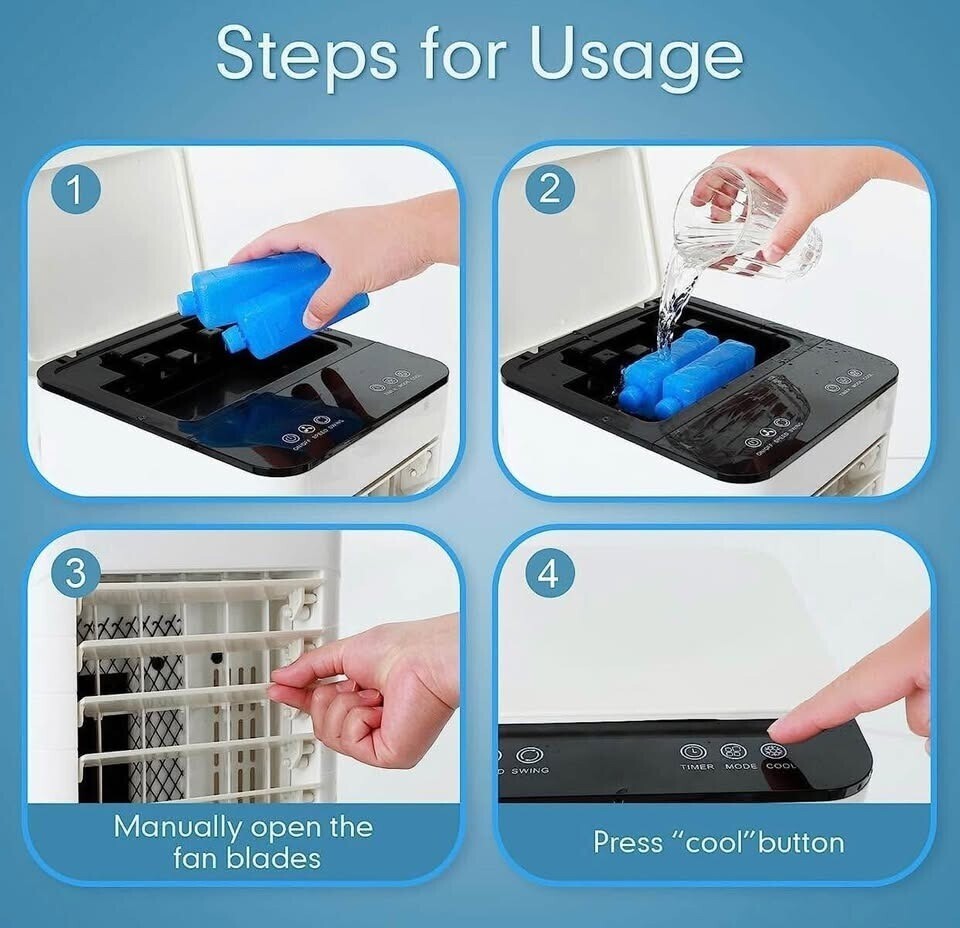 Fan Humidification Cooling 3-IN-1 If you live in a dry climate and want an cost-effective cooling solution, our evaporative cooler must be worth considering. There are 3 modes for you: wind/humidification by adding water/cooling quicker with ice. It combines the natural cooling properties of water with a steady breeze to lower indoor temperatures. Caynel stays professional and makes it possible for you to have both cooling and humidifying function simultaneously at a modest price!