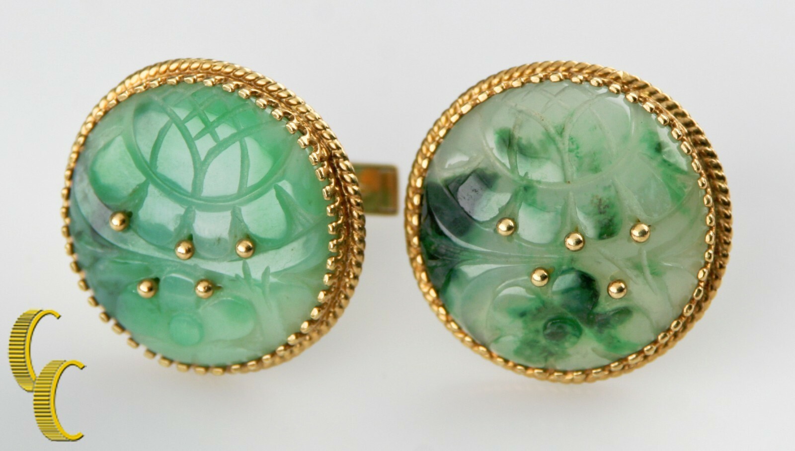 Cellino Vtg 18k/14k Yellow Gold Imperial Jade Cufflinks 28 mm Diameter 29.9 g