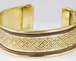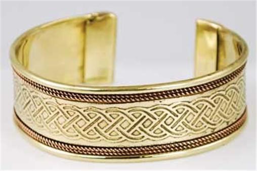 This bracelet is an elegant piece, appearing as the ancient cuffs worn by our Celtic ancestors. Crafted of brass and accented by copper, it features an elaborate design of interwoven Celtic knot work that sprawls from one end of the bracelet to the other.