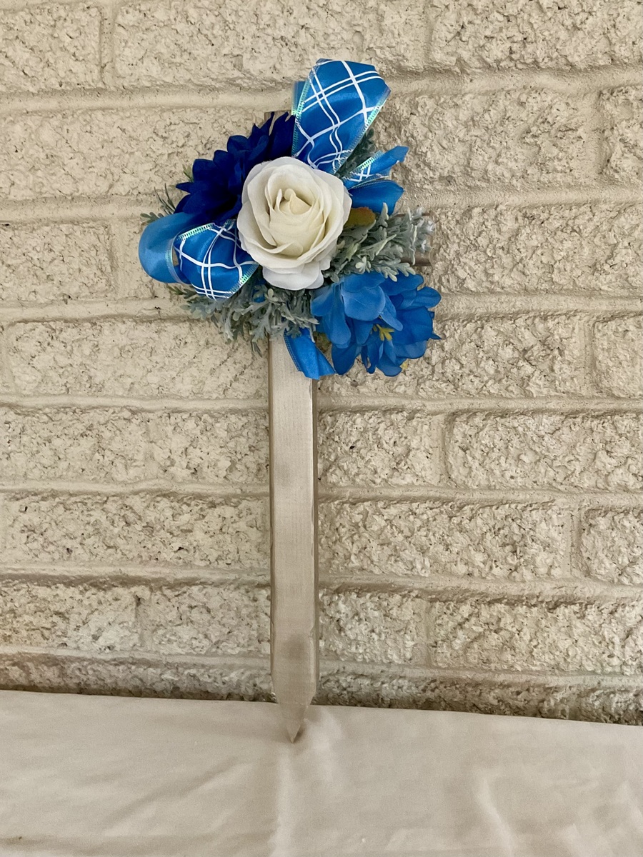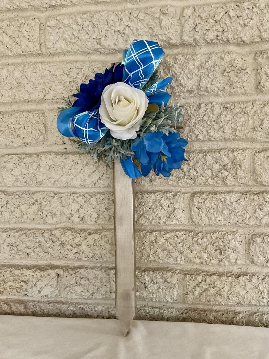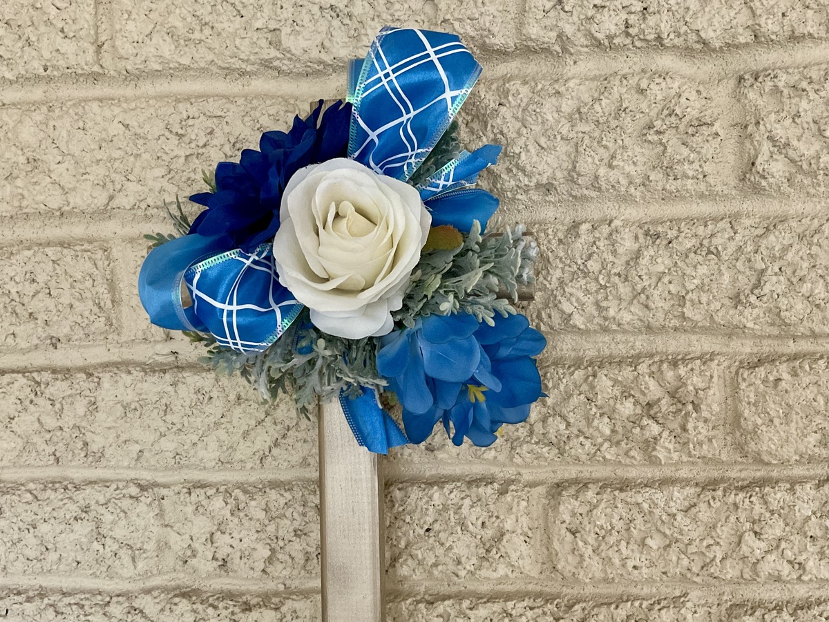 Enhance the beauty of your loved one's resting place with this 18” pine cemetery cross. Expertly hand-painted metallic and adorned with a dark blue star flower, an off white rose, layers of greenery, two bright blue poppies, and bright blue and white patterned ribbon. A heartfelt tribute that radiates peace and love. The cross has a pointed end for easy ground insertion. Every cross is sprayed with a coat of clear polyurethane to protect the ribbon and silk flowers from outdoor elements.