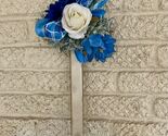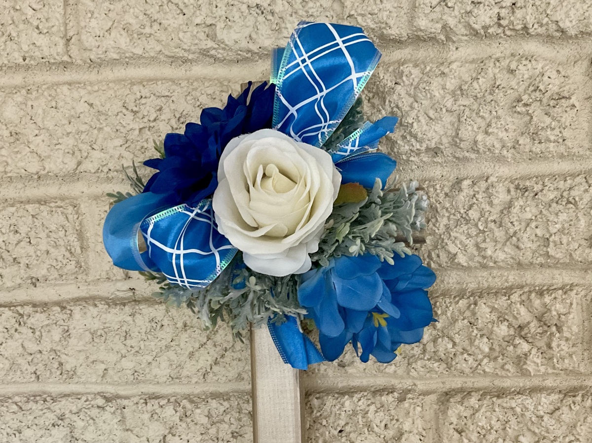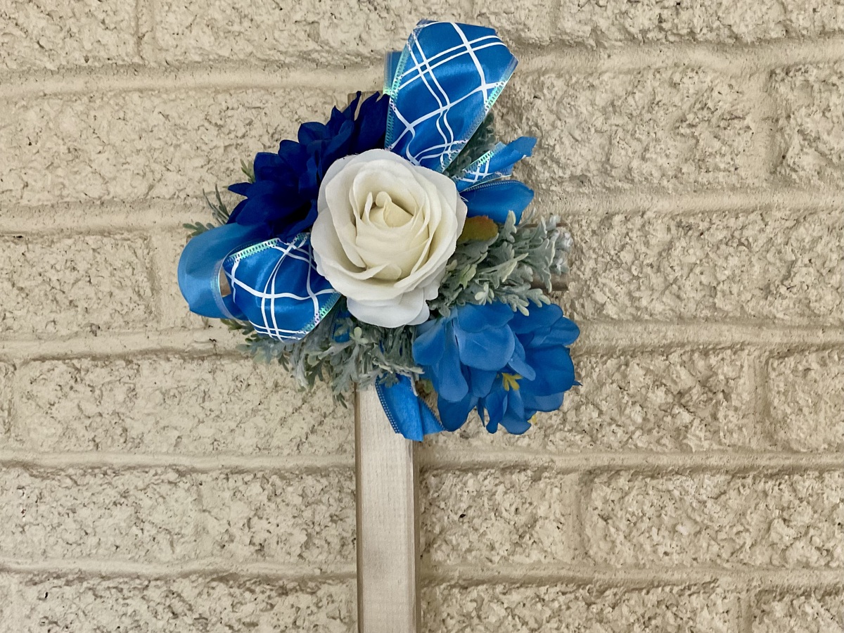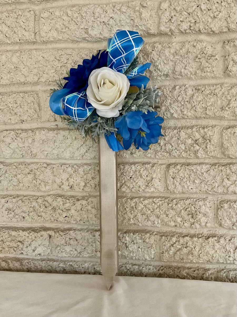 Enhance the beauty of your loved one's resting place with this 18” pine cemetery cross. Expertly hand-painted metallic and adorned with a dark blue star flower, an off white rose, layers of greenery, two bright blue poppies, and bright blue and white patterned ribbon. A heartfelt tribute that radiates peace and love. The cross has a pointed end for easy ground insertion. Every cross is sprayed with a coat of clear polyurethane to protect the ribbon and silk flowers from outdoor elements.
