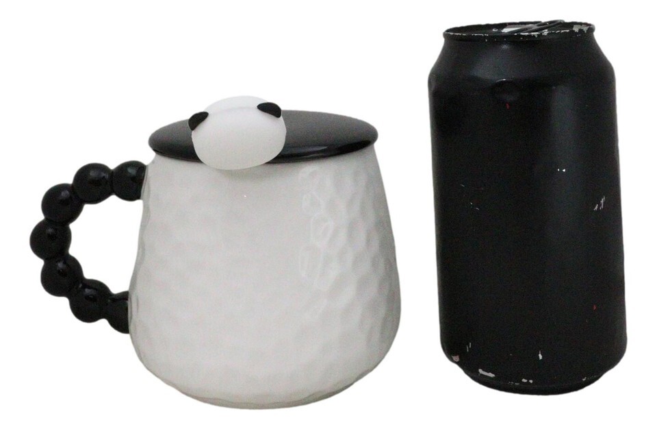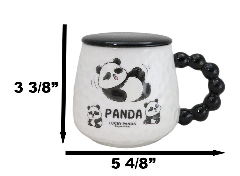 ? This Whimsical Panda Bear Mug With Lid measures 3.25" tall, 5.5" long and 4" in diameter. Mug has 14oz capacity. The spoon is 5" Long. Microwave and Dishwasher safe.