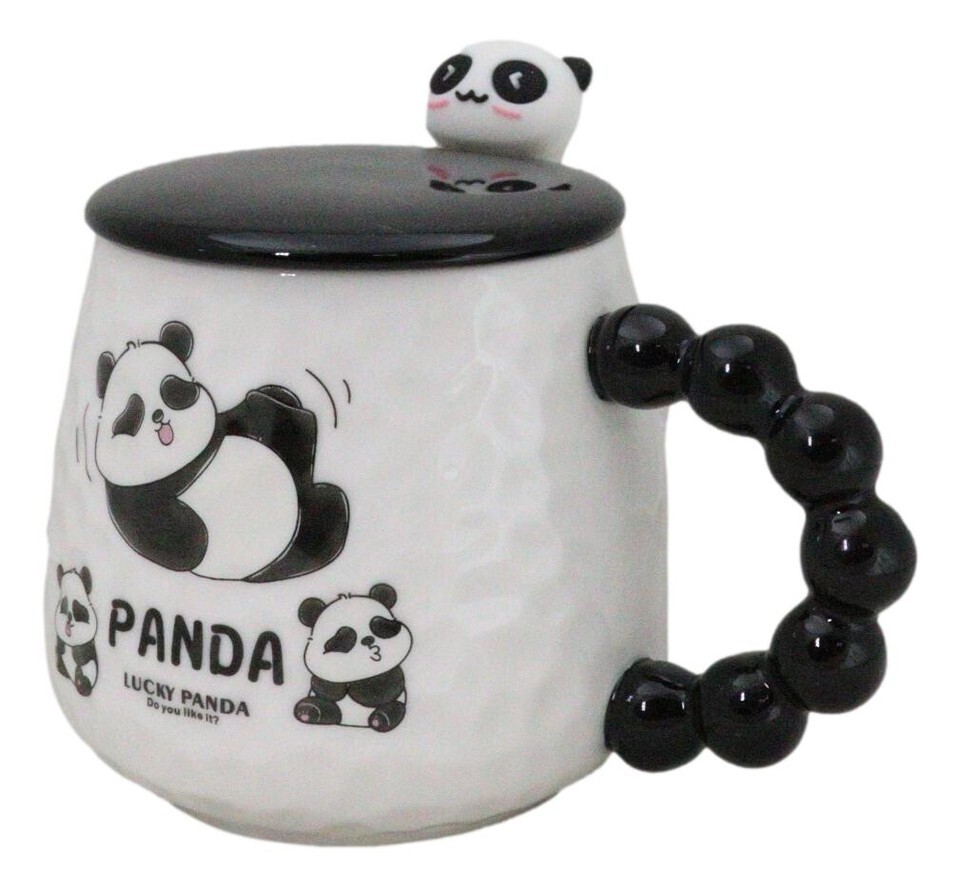 ? Introducing our charming Lucky Panda Bear Mug, the perfect blend of whimsy and functionality! This delightful mug features an adorable cartoon panda bear, sure to bring a smile to your face with every sip. Made from high-quality ceramic, it comes complete with a matching stirring spoon topped with a cute panda head handle, adding a playful touch to your morning coffee or tea ritual. The round ribbed mug handle allows for comfort grip as you sip away your favorite beverage.