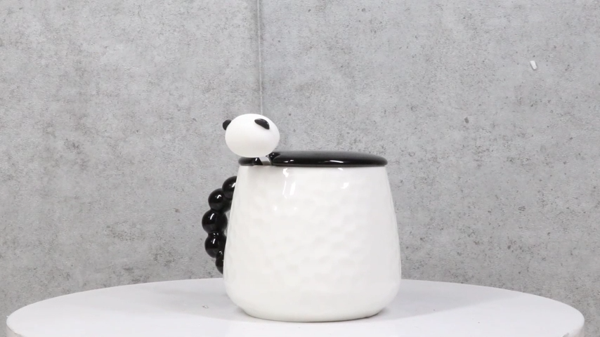 ? This Whimsical Panda Bear Mug With Lid is made of high quality ceramic porcelain. It comes with a stainless steel stirring spoon. CA Prop 65 Compliant. Color Tone May vary from pictures.