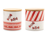 Festive Fun Design Striped and snowflake patterns with peppermint candy accents in classic red and white tones for a cheerful holiday look. Functional Decorative Includes natural wood lids for easy storage of holiday candies, cookies, or small treats. Perfect for Entertaining Ideal for filling with sweets or using as a decorative accent on your Christmas table. Suitable for indoor use only