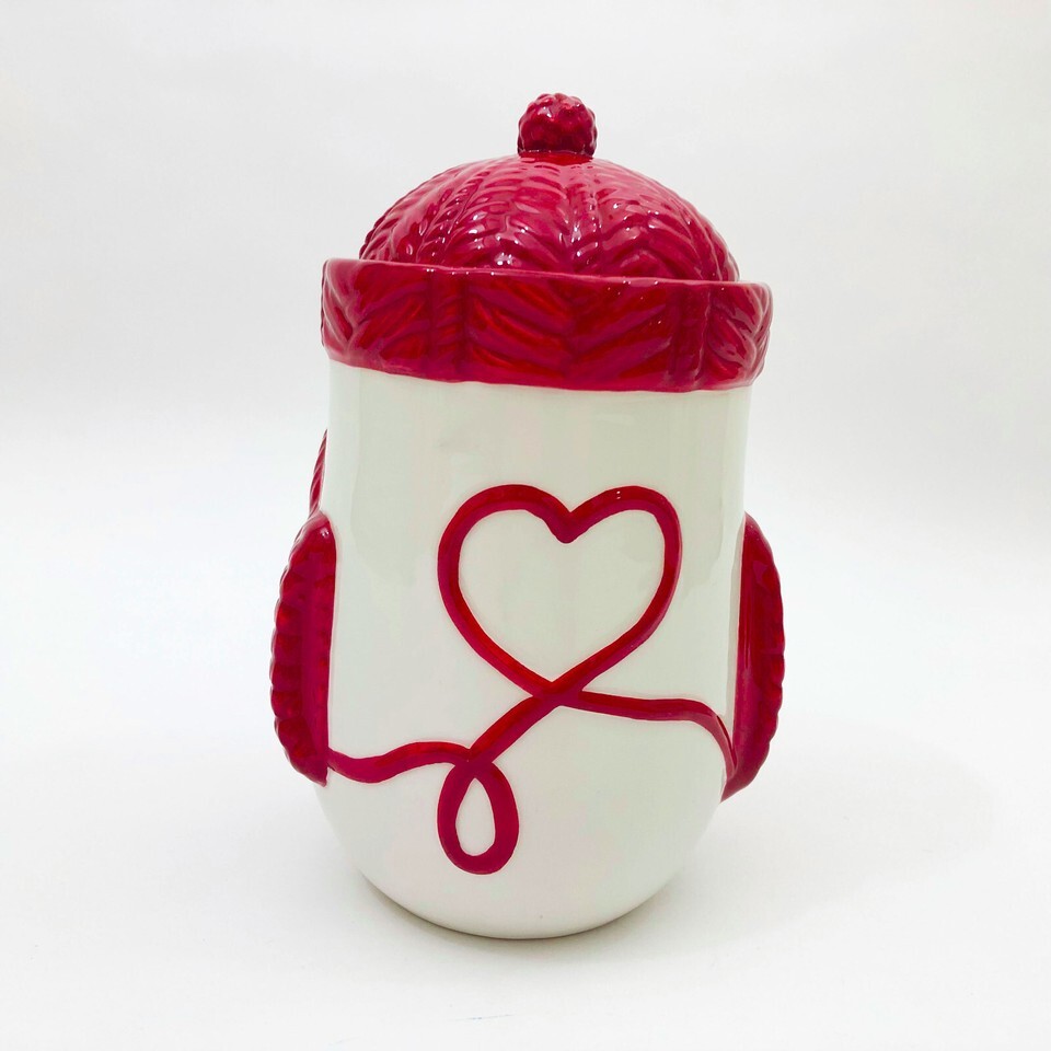 This beautiful cute snowman treat jar has his mittens wrapped around the treat jar. A cute snowflake is on each of his mittens. He has a red stocking cap for a lid and on the back is a heart formed out of his mitten strings. A beautiful cute addition to your winter kitchen or dining room TREAT area.
