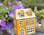 A charming yellow and cream glaze village Tea Room candle/tealight features a tiled roof with open chimney, dorma windows with sign 'Tea Room'. It would look lovely when displayed on a shelf or windowsill.
