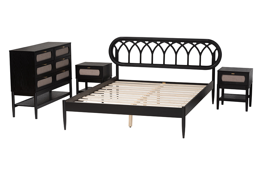 Features: Constructed from rubberwood, MDF wood, and LVL Walnut brown finish Cut-out headboard reminiscent of cathedral architecture Each piece is padded with foam and upholstered in fabric No Box Spring Required: Wood slats eliminate the need for a box spring Tapered legs provide excellent stability in sleek design Set Includes: One (1) Queen Size Bed; Two (2) Nightstands; One (1) Dresser