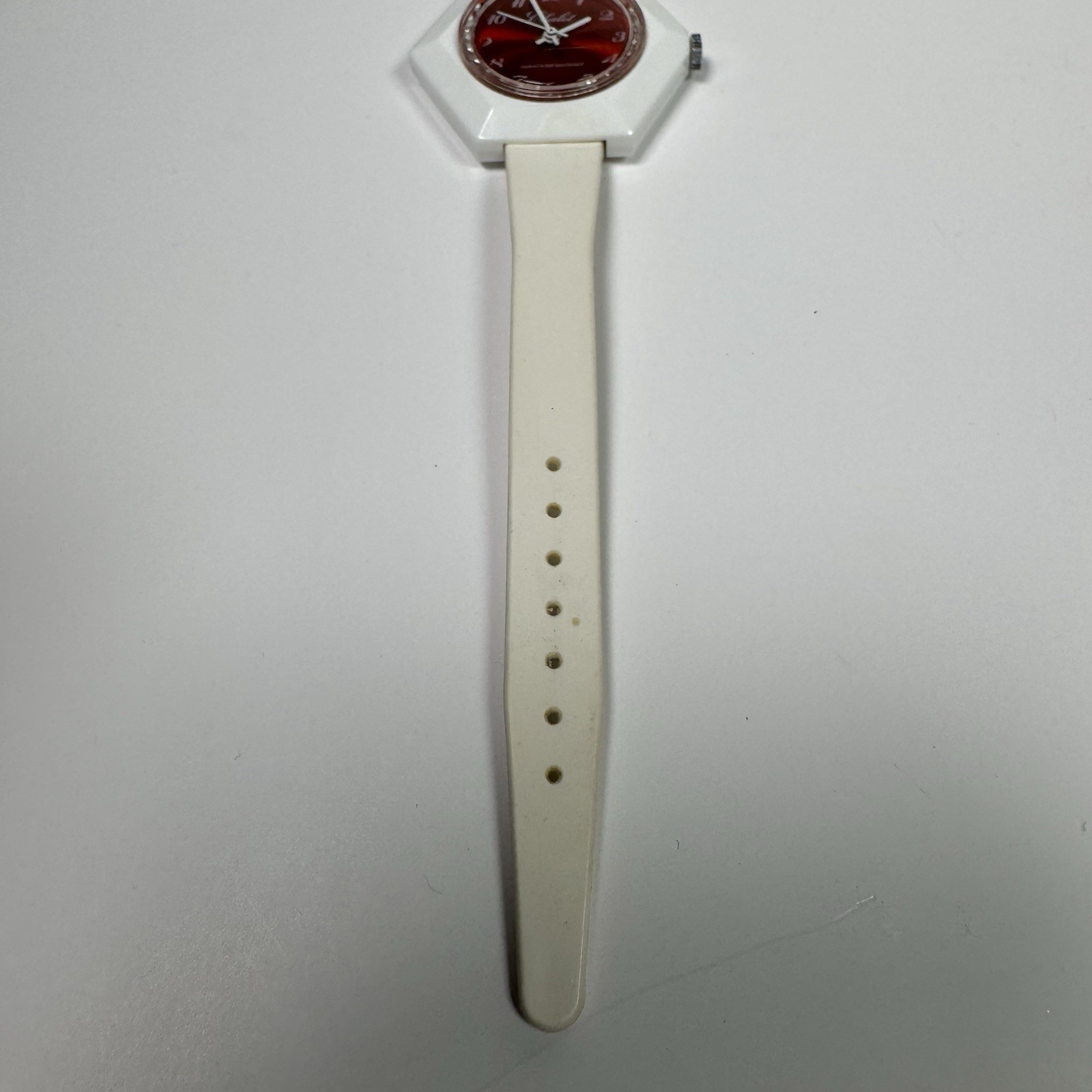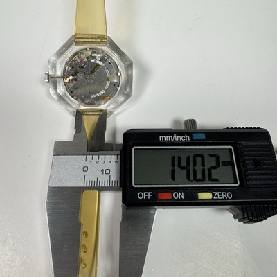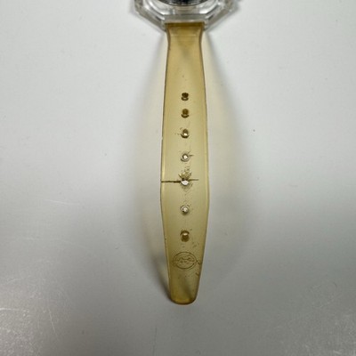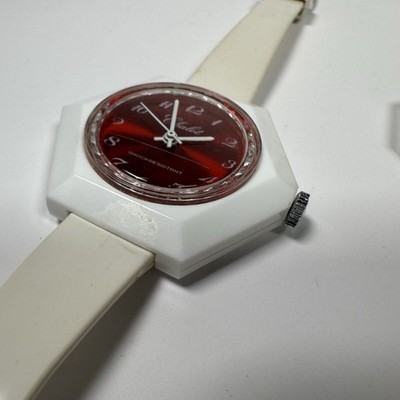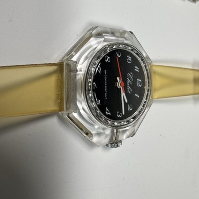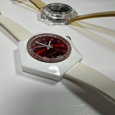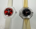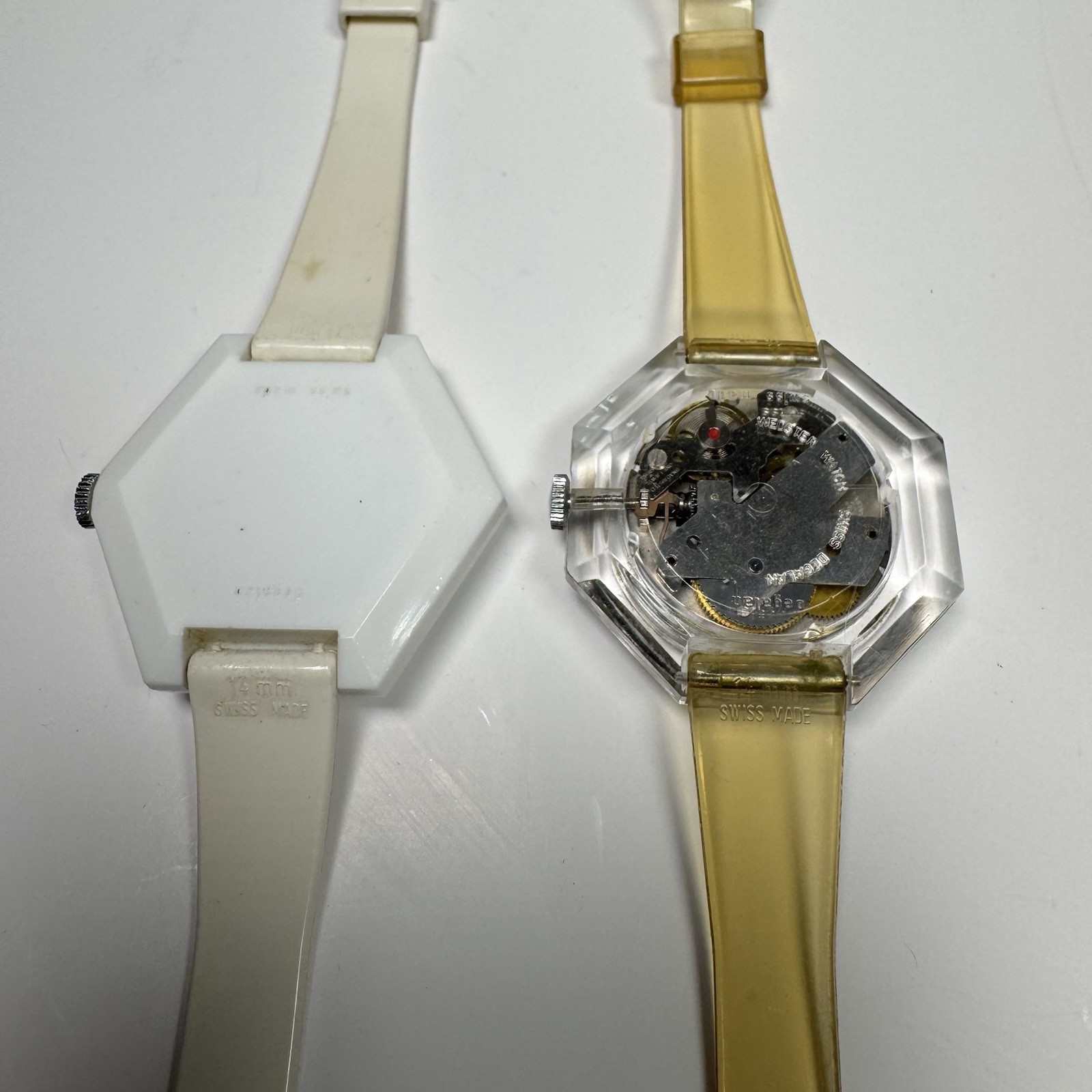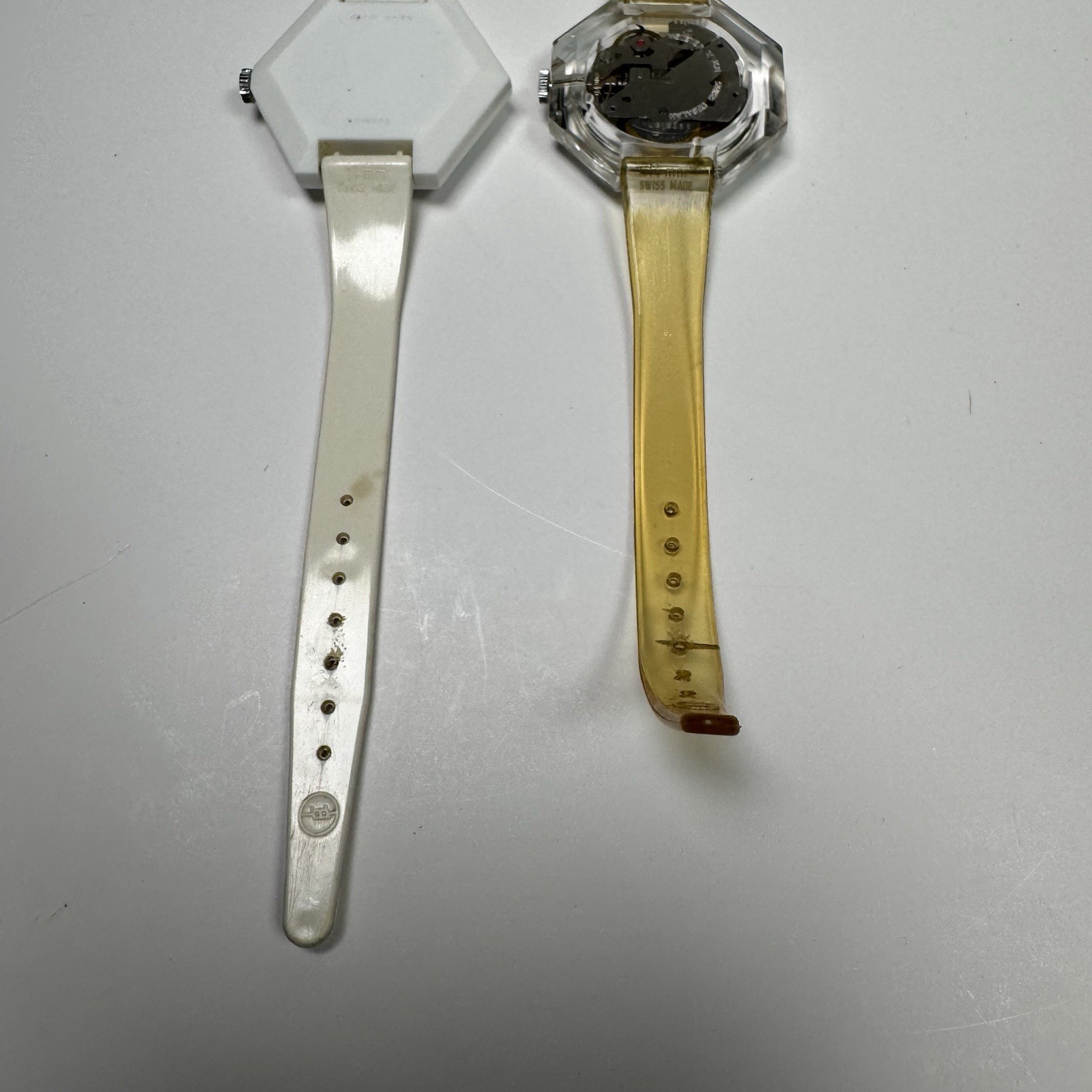 The sell is for both watches as shown in the photos. The white watch crown is jammed and will not turn. However, you can still pull the crown out and adjust the time, but the wind up does not work and the watch does not run. The clear watch works and operates fine and seems to keep good time. The band has yellowed overtime and the lower portion of the band has a crack in it as shown. See pictures for more details.