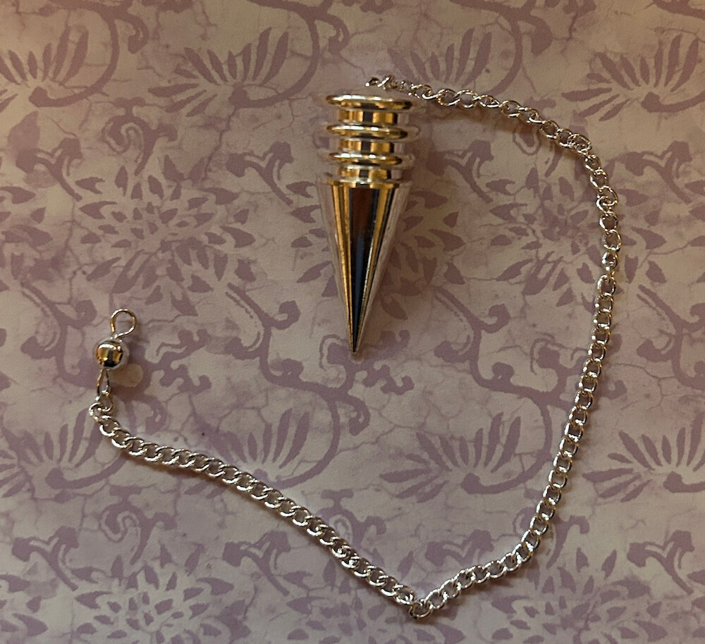 This pendulum measures approximately 1.5 inches long and has a chamber to keep potions, charms or something sentimental close. About 7.5 inches long with chain.