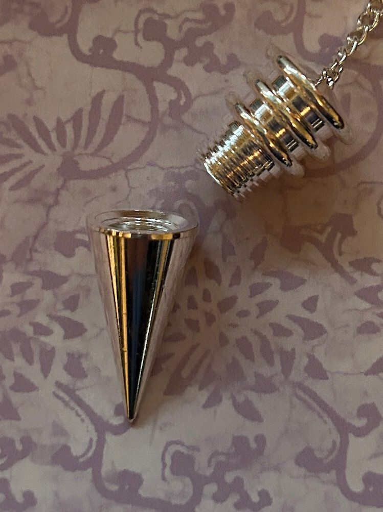 This pendulum measures approximately 1.5 inches long and has a chamber to keep potions, charms or something sentimental close. About 7.5 inches long with chain.