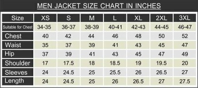 Te sugerimos que el tamaño del pecho de la chaqueta debe ser 4 pulgadas mas grande que el tamaño real del pecho de tu cuerpo. Si tu pecho real es de 30 pulgadas, entonces tienes que seleccionar el tamaño del pecho de 34 pulgadas de nuestra tabla de tallas.
