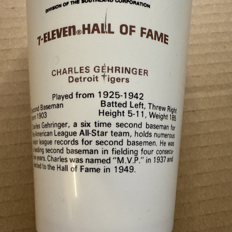 - Charles Gehringer Detroit Tigers Hall Of Fame 7-11 Slurpee Cup 1970s Damaged Lip