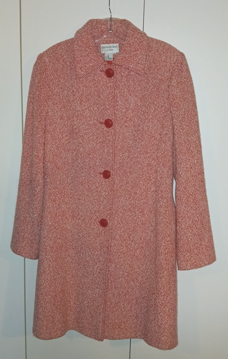 THIS IS A LOVELY LADIES CHARLES GRAY LONDON RED/WHITE SPECKED WOOL/NYLON/MOHAIR COAT IN A SIZE MEDIUM. IT IS IN EXCELLENT, BARELY WORN, CONDITION.