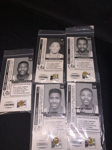 Show your love for the Charlotte Hornets with this "The Hive Five" Crown Promo Pins - Complete Set. This vintage set features pins from the 1993 season, featuring Larry Johnson and Alonzo Mourning. With the team's iconic Crown logo, these pins are a must-have for any true fan.