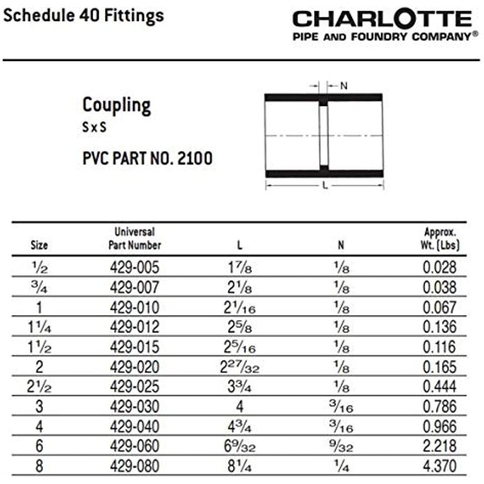 PVC Schedule 40 fitting that is for pressure systems where temperatures will not exceed 140 F. They are highly resilient, with high-tensile and high-impact strength. PVC Schedule 40 has better sound deadening qualities than PVC Schedule 40 DWV Foam Core and ABS Foam Core. Installation requires the use of primer and solvent cement. All Charlotte Pipe products are manufactured in the USA.