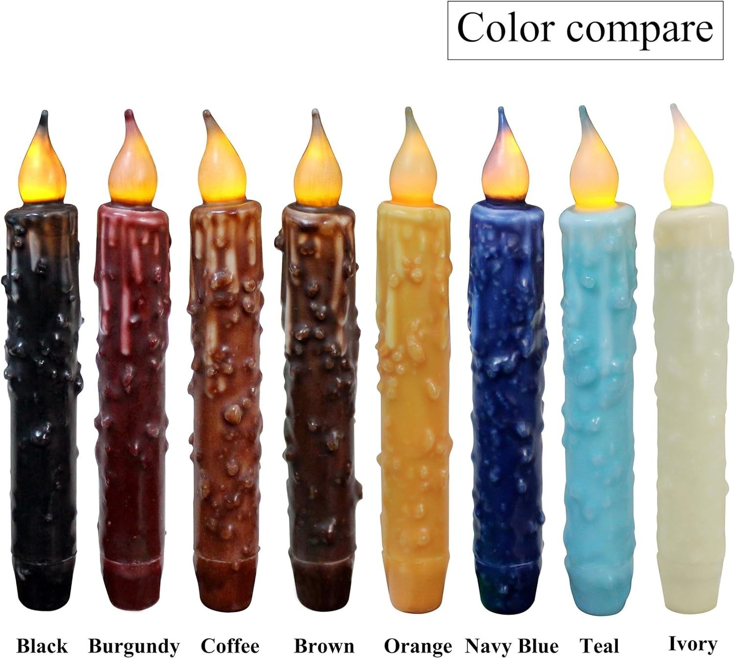 Discover our vintage-inspired flameless taper candles, meticulously handcrafted with textured wax finishes and realistic drips for an authentic candle look. Each 6-3/4" L x 1" D candle operates on 2 AA batteries (not included), featuring easy ON/OFF control and a convenient 6-hour timer. The tapered base fits standard holders, making them perfect for enhancing your home decor, holiday celebrations, weddings, or special events. Suitable for use on countertops, shelves, walls, or within floral arrangements, these charming candles create a warm, inviting ambiance without the risks of real flames.