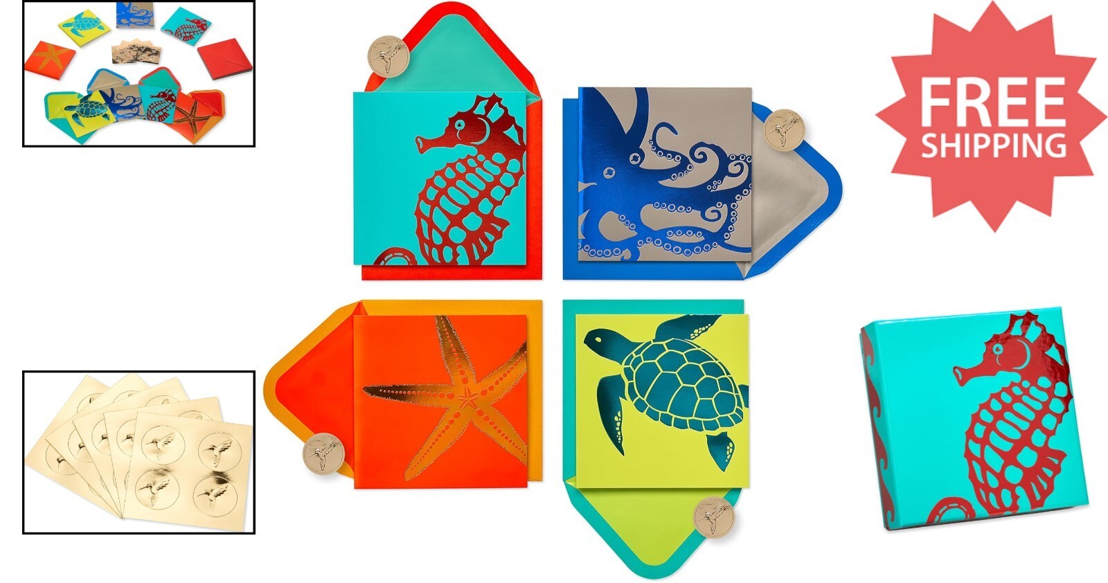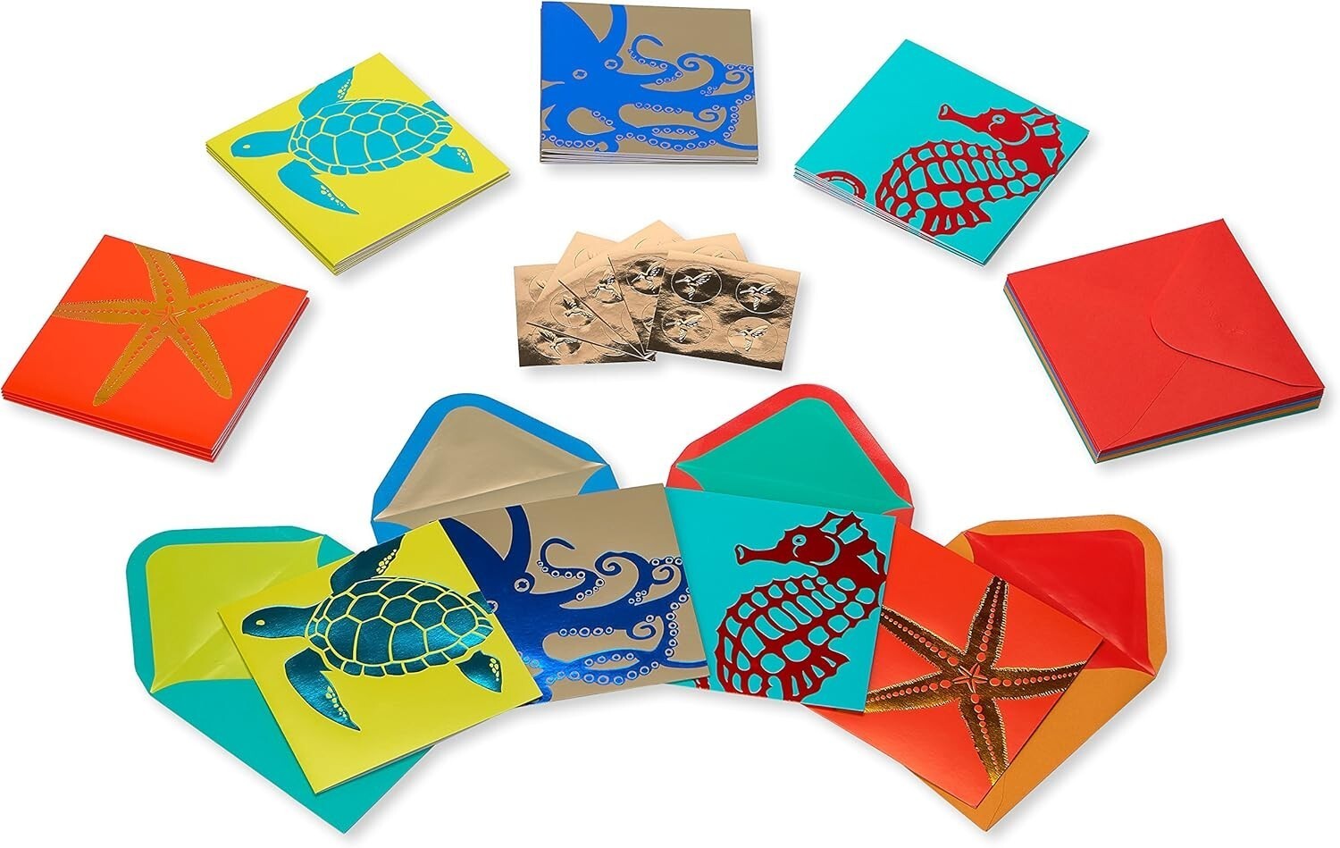 Features: Including Envelope,Blank inside,Foil embellished,Decorative protective box,Multi-color envelopes,Gold Papyrus seals,Unique ocean creature designs,Coordinating envelopes,Special occasion versatility