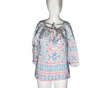 Lightweight and airy, this Charter Club top is made from 100% linen and features a vibrant boho-inspired pattern in shades of pink and blue. Designed in a classic peasant style, it includes a scoop neckline with tie detail, 3/4 sleeves with elastic cuffs, and a relaxed fit that pairs perfectly with jeans or shorts. Ideal for warm weather or layering.