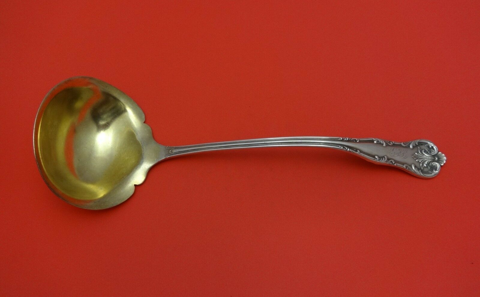 Sterling Silver SOUP LADLE GOLD WASHED 12" in the pattern CHATELAINE BY LUNT. It is monogrammed (monos vary) and is in excellent condition.