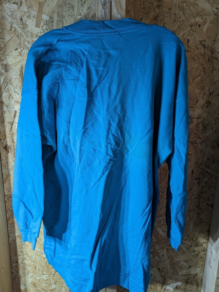 Show off your wild side with this blue ladies sweatshirt featuring a cheetah print. Made of 100% cotton, this pullover sweatshirt is perfect for any occasion, especially when you want to add a touch of activewear to your look. With a flattering V-neckline, this sweatshirt is designed for regular size women and is available in medium.