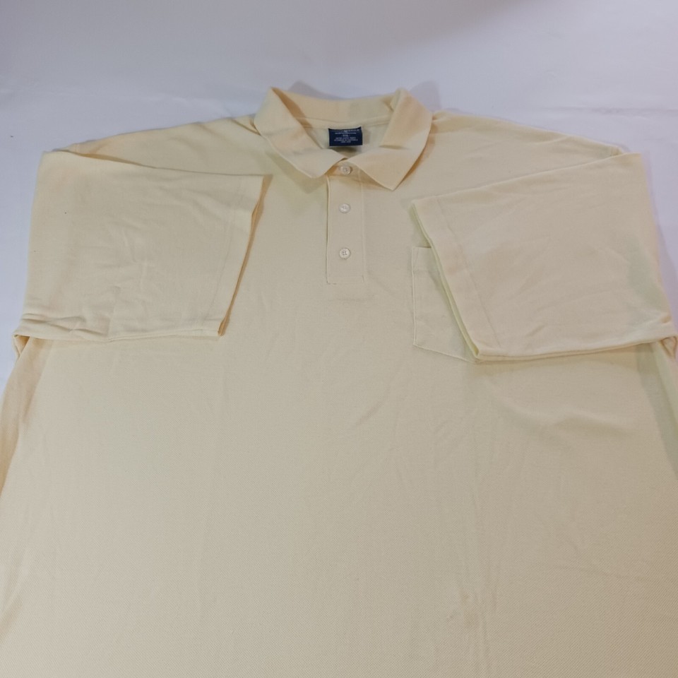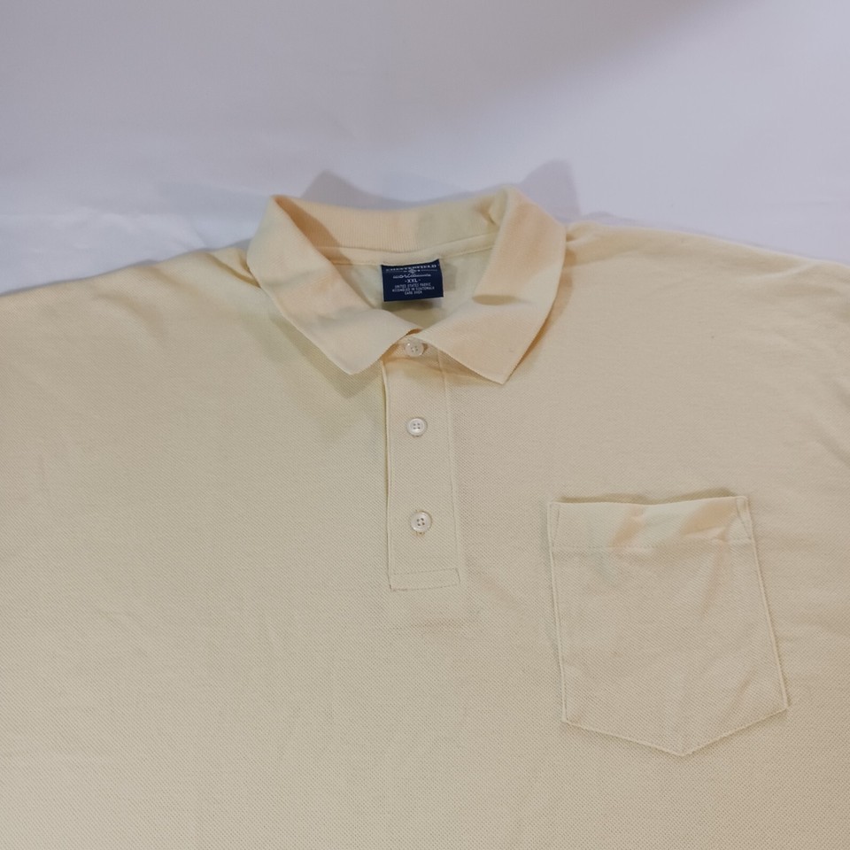 Introducing a classic yellow short sleeve polo shirt from Chesterfield Worldwide, size 2XL. This shirt features a front pocket and is made from a combination of polyester and cotton fabric wash. The shirt is perfect for summer, fall, and spring seasons, and it comes in a solid pattern with a medium wash.