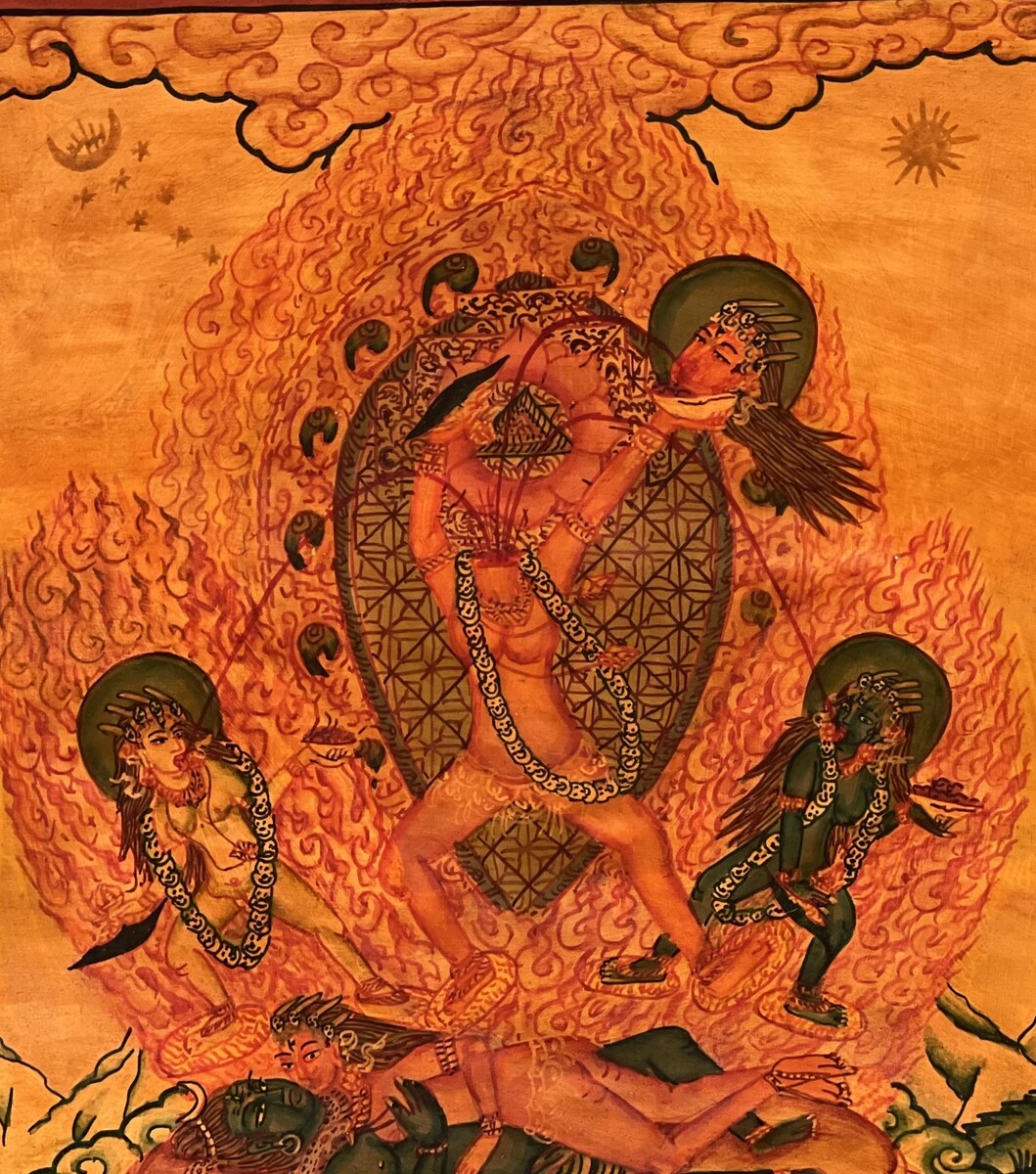 The legends surrounding her emphasize themes of self-sacrifice, maternal elements, and self-destructive fury, making this painting a profound reflection on existence and the divine.
