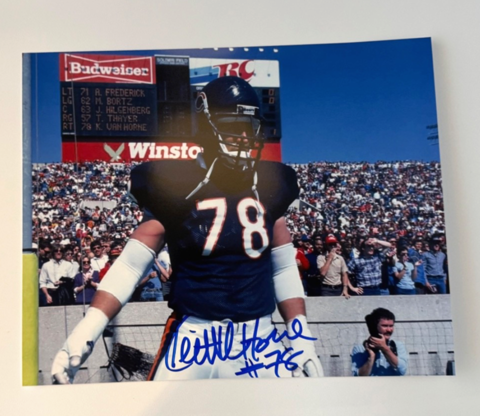 The product is an 8x10 photo signed by former Chicago Bears player Keith Van Horne, who played in the 1985 NFL season. This original photo is a unique collectible item for fans of the Chicago Bears and football enthusiasts alike. The photo captures a piece of sports history, making it a valuable and meaningful addition to any sports memorabilia collection.