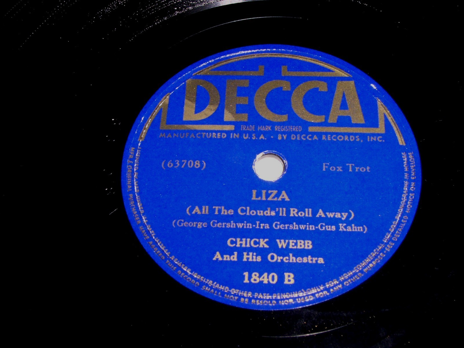 This is a vintage 78 Rpm phonograph record by Chick Webb And His Orchestra entitled, "A-Tisket A-Tasket". Flipside: "Liza". Record label: Decca 1840.