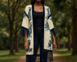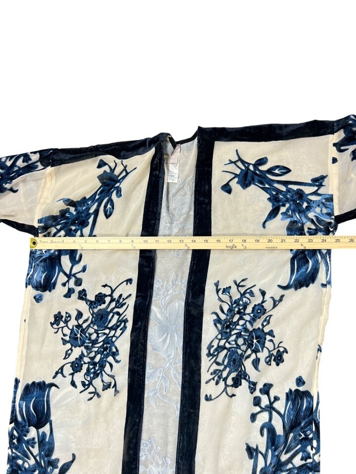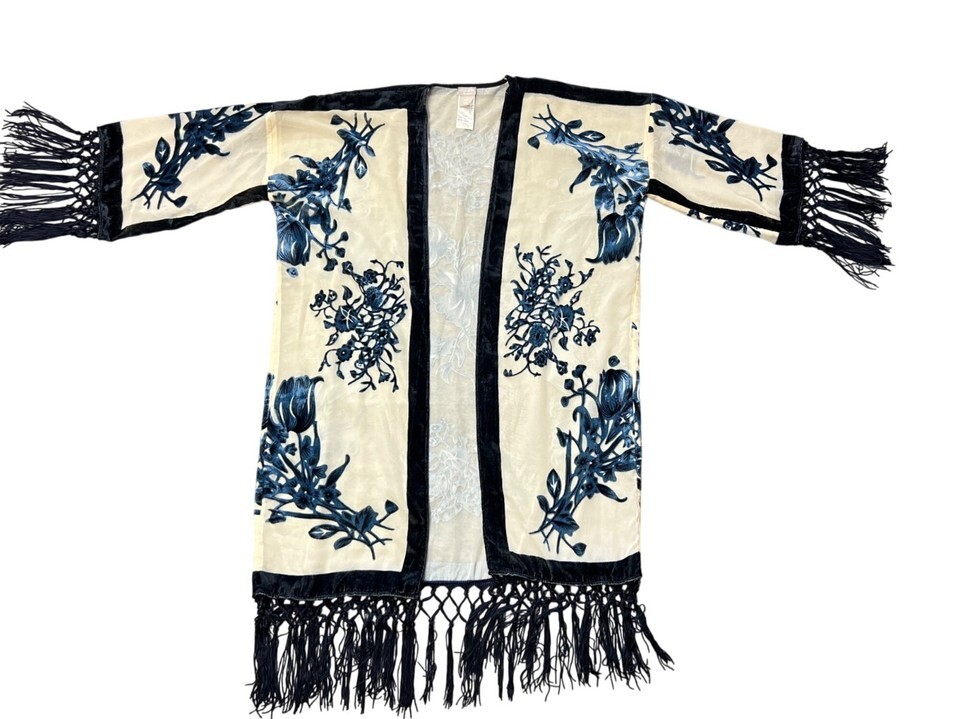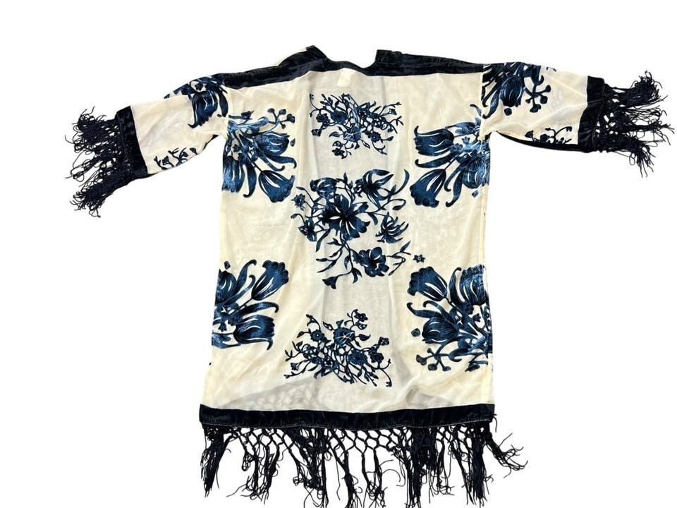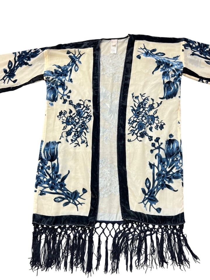 - Chico’s Travelers Kimono Cardigan S/M Beige Blue Burnout Velvet Floral Fringe
