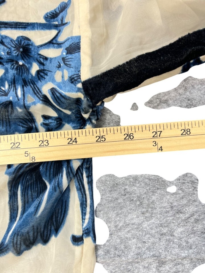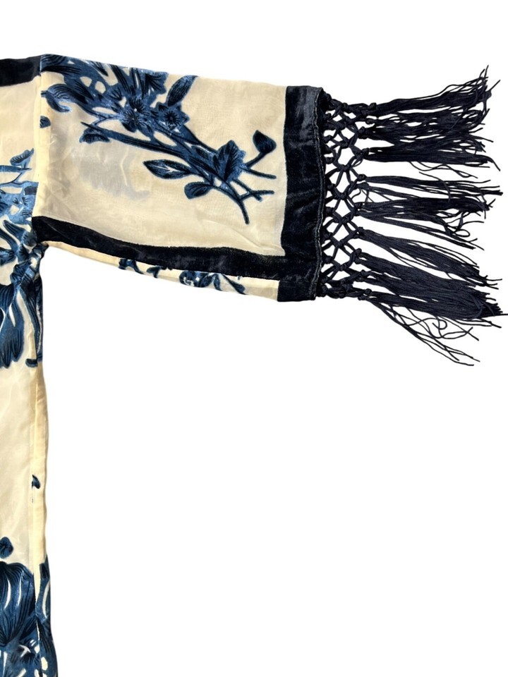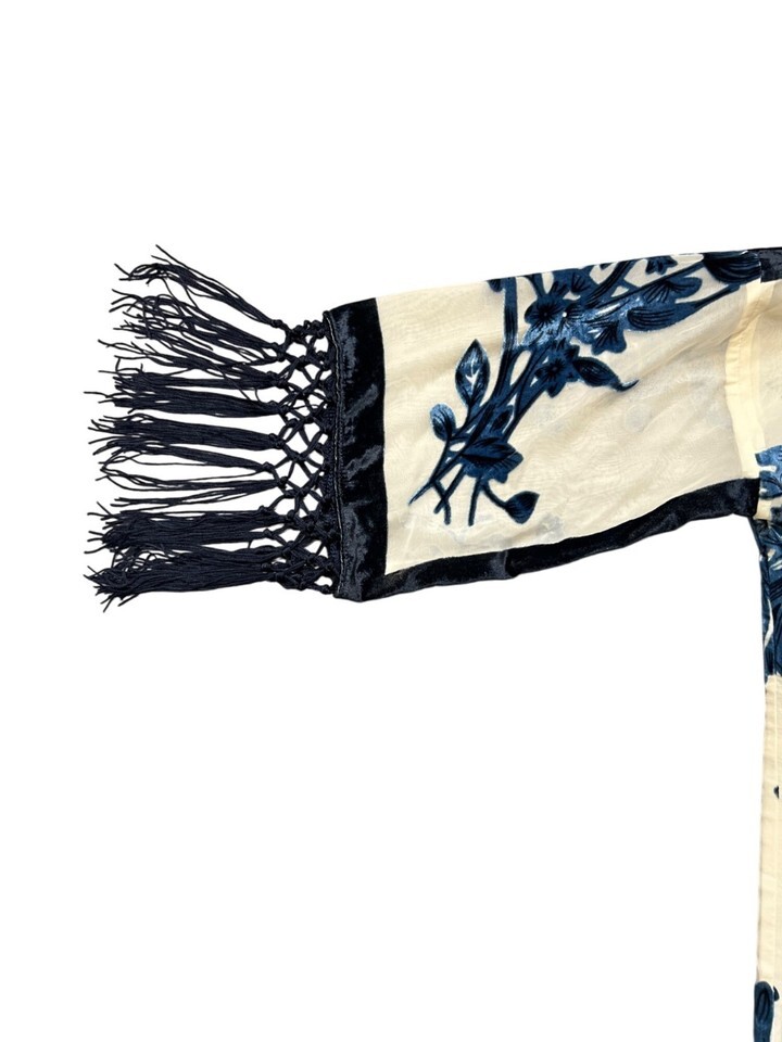 Chico’s Travelers Kimono Cardigan S/M Beige Blue Burnout Velvet Floral Fringe