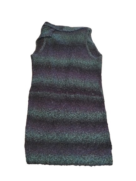 Chico?s long shimmering knit sweater vest in size Medium. Open front design with blended dark tones and subtle sparkle.
