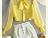 - Chiffon Yellow Lapel Neck Perspective Top OL Shirt White Casual Pants Sets
